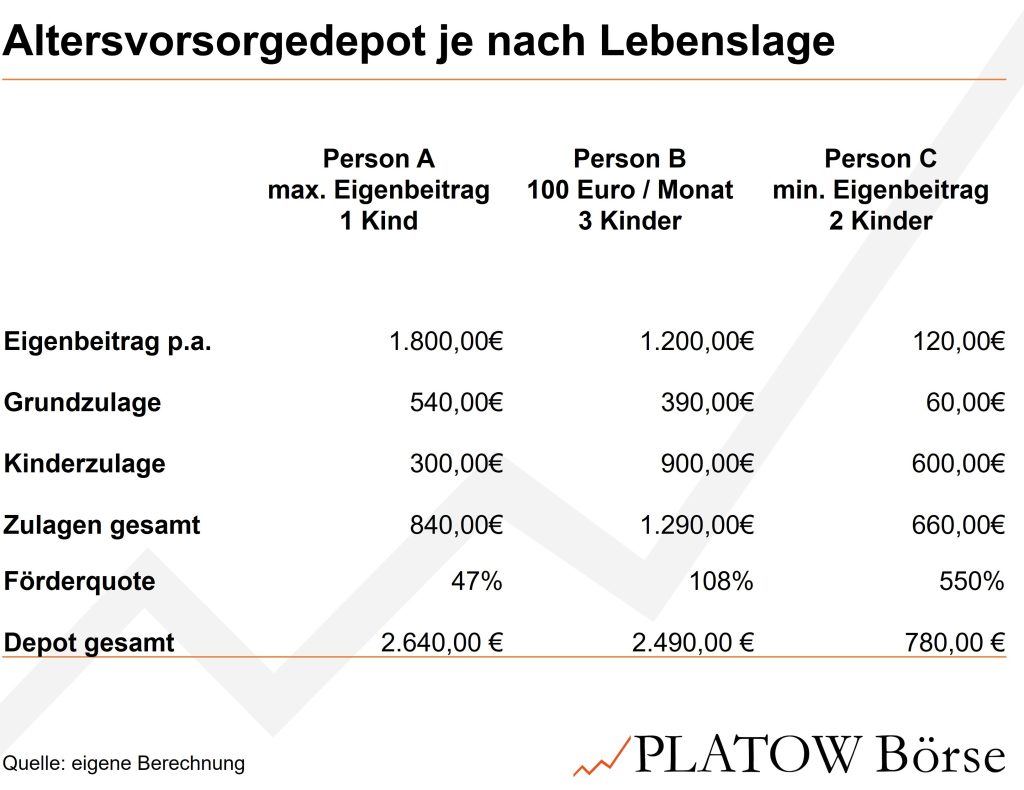Der Bruch ist fundamental. Die starre Beitragsgarantie, die Riester in Anleihen zwang und Aktienquoten deckelte, fällt. An ihre Stelle tritt ein Altersvorsorgedepot, das Investments in ETFs, Fonds und Aktien ermöglicht. Die Förderung wird einfacher und planbarer: Für die ersten 360 Euro Eigenbeitrag gibt es 50% Zuschuss, darüber hinaus bis 1.800 Euro noch 25% – insgesamt bis zu 540 Euro pro Jahr, plus 300 Euro je Kind. Einstiegshürden gibt es praktisch keine: Ab 10 Euro monatlich kann investiert werden – auch betrieblich und erstmals auch für Selbstständige.
