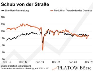 Die Märkte setzen also verstärkt auf die Erholung der heimischen Wirtschaft. Erste Hinweise darauf sind in der Tat vorhanden: Der Auftragseingang im verarbeitenden Gewerbe ist in den vergangenen drei Monaten spürbar gestiegen, Die Einkaufsmanager sind positiver gestimmt und auch die Produktion zieht wieder an. Spannend zu beobachten ist die Lkw-Maut-Fahrleistung, die seit rund fünf Jahren eng mit dem Produktionsindex des verarbeitenden Gewerbes korreliert. Der Dezember lieferte dabei eine überraschend deutliche Belebung auf 96,8 (November: 93,8).