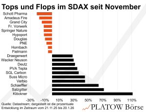 Seit Mitte November 2025 lässt sich an den Aktienmärkten ein klarer Trend beobachten: Anleger wenden sich verstärkt mittelgroßen und kleineren Unternehmen zu. Während der DAX in der Zwei-Monats-Periode vom 21. November 2025 bis zum 20. Januar 2026 um 6,2% zulegte, stiegen der MDAX um 8,8% und der SDAX sogar um 12,4%. Bis Mitte Januar war die Bewegung sogar noch stärker, ehe Donald Trumps „Streit um ein Stück Eis“ die Märkte vorübergehend durcheinanderbrachte. Auch über Deutschland hinaus ist die Entwicklung erkennbar: In den USA legte der Russell 2000, der kleinere Unternehmen abbildet, um 11,8% zu, während der S&P 500 mit den großen Standardwerten nur 2,9% gewann.