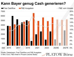 Ein Blick auf die Historie zeigt, was auf dem Spiel steht. In den Jahren 2015 bis 2019 erwirtschaftete Bayer regelmäßig einen Free Cashflow zwischen 4 und 6 Mrd. Euro jährlich. Diese Phase robuster Mittelzuflüsse ist vorbei. Schon in den vergangenen Jahren war der geringe Mittelzufluss das große Problem des Pharma- und Agrarchemiekonzerns. Jetzt drohen neue, jahrelange Belastungen.