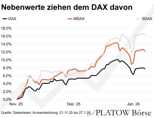 Wir haben gegenüber unserer ersten, nur auf die Kursentwicklung fokussierten Analyse den Bobachtungszeitraum noch einmal leicht bis zum 27. Januar verlängert. Das Bild wird dadurch sogar klarer: Während der DAX seit dem 21. November um 7,8% stieg, legten MDAX und SDAX bei den Kursen um 12,3% bzw. 16,4% zu.