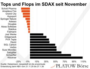 Demgegenüber liegen Konsum- und Dienstleistungstitel wie Fielmann (-3,5%), Douglas (-6,2%) oder Amadeus Fire (-18%) zurück. Auch einzelne Softwarewerte wie Atoss Software (-5,4%) oder Adesso (-7,4%) bleiben zurück. Ausgewählte Finanz- und Immobilienwerte wie Hypoport (-14,8%) und Grand City Properties (-15,4%) zeigen ebenfalls relative Schwäche.