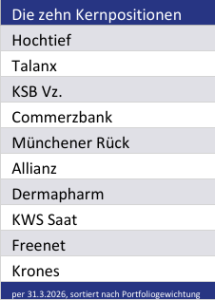 Dieser ungewöhnlich kurzen Gewinnerliste steht eine ellenlange Verliererliste gegenüber. 17 Aktien büßten gegenüber Ende Februar sogar prozentual zweistellig an Wert ein. Darunter war auch Schwergewicht KSB Vz., das kurz zuvor noch ein neues Allzeithoch erreicht hatte. Am härtesten erwischte es Einhell Vz., Kontron und Henkel St. In manchen Fällen halfen auch gute 2025er Ergebnisse nicht, die verhaltenen Ausblicke auf 2026 wogen oft schwerer. Immerhin war der Insidersaldo der Fondstitel im März klar positiv: Bei Einhell, Gea, Heidelberg Materials, Kontron, MLP, Münchener Rück, Siemens und TUI registrierten wir (für uns relevante) Käufe im Rahmen von Directors‘ Dealings; nur bei Siemens zusätzlich Verkäufe.
