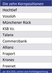 Das lässt sich auch in der Liste der zehn größten Positionen (siehe Tabelle) verfolgen: 1. Dass derzeit alle Kernpositionen in mindestens einem Auswahlindex enthalten sind, ist ein Resultat unseres Investmentprozesses. Aktiv angesteuert haben wir diese Zusammensetzung nicht, und in der Fondshistorie ist sie eher ungewöhnlich. 2. Manche Kernpositionen wechselten ihre Indexzugehörigkeit in der jüngeren Vergangenheit. Ein extremes Beispiel ist die Krones-Aktie, die 2023 im SDAX begann, in den MDAX aufstieg, herausfiel, einige Zeit in gar keinem Auswahlindex notierte und dann in den MDAX zurückkehrte. Die Vorzugsaktie von KSB hatten wir bereits im Fonds, als sie 2023 in den SDAX aufrückte, ähnlich Talanx beim MDAX-Aufstieg 2021. All diese teilweise abrupten Anpassungen verfolgten wir aufmerksam. Gleichwohl änderten wir nichts Grundsätzliches an unseren Dispositionen – und das war im Nachhinein betrachtet in allen drei Fällen sehr gut so. Mit ruhiger Hand steuerten wir den DWS Concept Platow auch im September. Das war diesmal noch naheliegender, verlief der Berichtsmonat doch nicht wie ein „typischer“ September, sondern erstaunlich unauffällig. So schlossen DAX und MDAX minimal im Minus, der TecDAX etwas klarer im roten Bereich und der DWS Concept Platow dazwischen. Lediglich der SDAX gewann leicht an Wert.