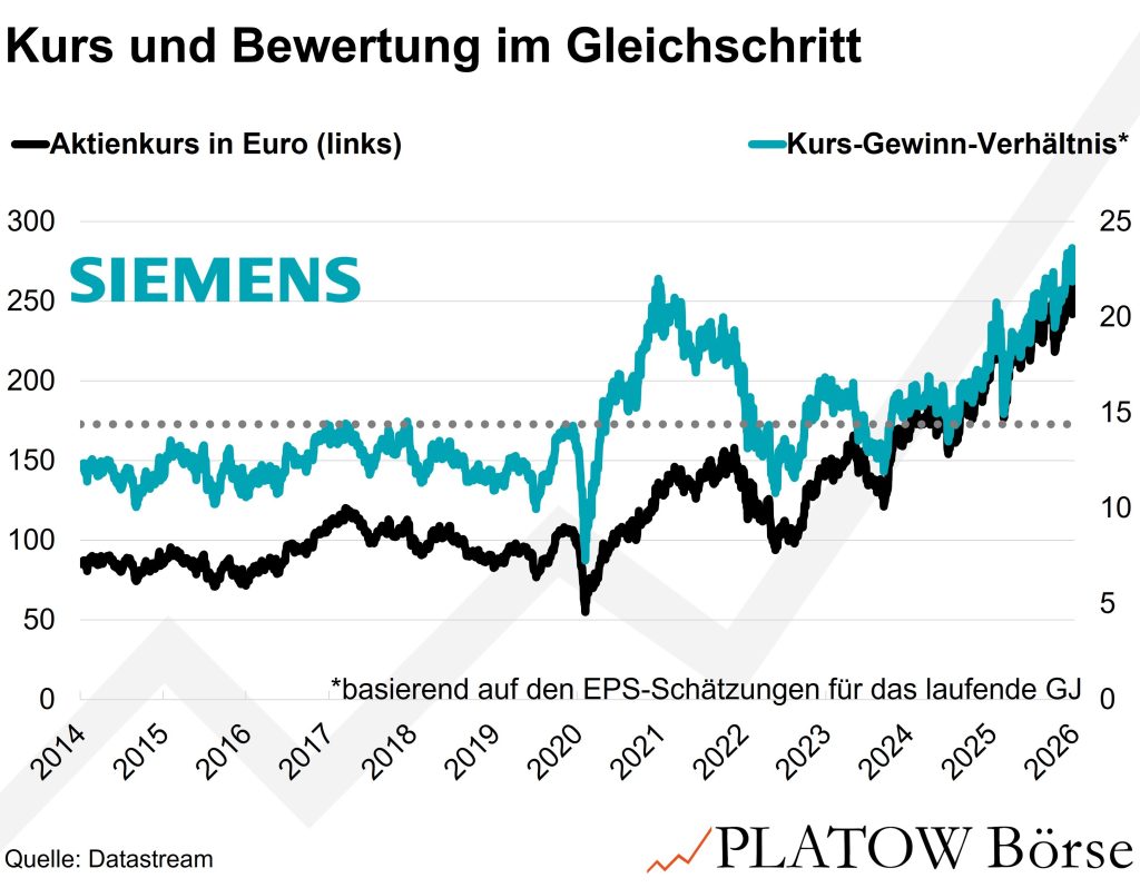 Klarer Treiber ist DI – nachdem das Geschäft im Q3 noch Sorgen machte. Die Sparte steigert den Umsatz um 10% auf 4,5 Mrd. Euro, wobei die operative Marge von 14,5% auf 17,8% springt. Das Geschäft mit der Automatisierung zieht wieder an, insbesondere in China, Integrationskosten für Altair und Dotmatics fallen niedriger aus als befürchtet. Wichtig wird jetzt aber, dass die Dynamik keine Eintagsfliege bleibt. Auch SI überzeugt: Auftragseingang +22%, mehrere Großaufträge aus dem Rechenzentrumsumfeld, Marge bei 19,0%. Die industrielle KI-Story zeigt sich langsam in den Zahlen. Dementsprechend hat das Management die Prognose für das Ergebnis je Aktie vor PPA-Effekten auf 10,70 bis 11,10 Euro angehoben und eine Dividendenerhöhung auf 5,35 Euro vorgeschlagen. Das entspricht einer Dividendenrendite von rund 2,2%.