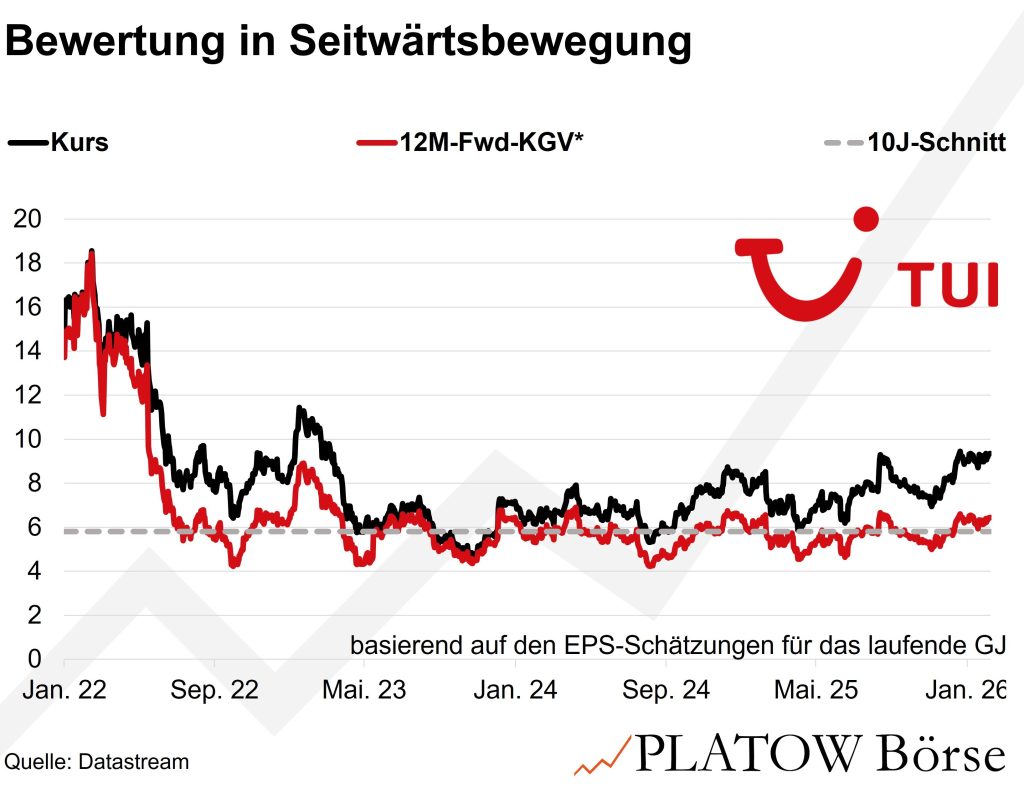 Kurzfristige Störfeuer dürften damit zwar nicht ausbleiben. Mittelfristig sehen wir Tui jedoch klar auf Kurs. Ein EBIT-Wachstum von 7-10% pro Jahr bis 2028/29 bei einer Zielverschuldung von unter 0,5x halten wir für realistisch. Dafür ist die Aktie mit einem 12-Month-Forward-KGV von 6 attraktiv bewertet. Zum Vergleich: Dank steigender Gewinnerwartungen verlief die Bewertung zuletzt seitwärts. Sie entspricht damit aktuell dem historischen Schnitt der Post-Corona-Jahre, ist aber nur halb so hoch wie vor der Pandemie. Der Wandel hin zum profitableren Urlaubserlebnis-Geschäft spiegelt sich hier wider.