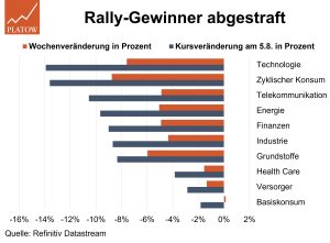 So legten seit den schwachen Arbeitsmarktdaten von Donnerstag (1.8.) lediglich Basiskonsumgüter minimal (+0,1%) zu. Moderate Verluste verzeichneten Aktien defensiver Sektoren wie Versorger (-1,4%) und Health Care (-1,6%). In der Spitze fielen die Kursverluste in diesen drei Sektoren mit einem Minus zwischen 1,8 bis 3,9% mit Abstand am geringsten aus.