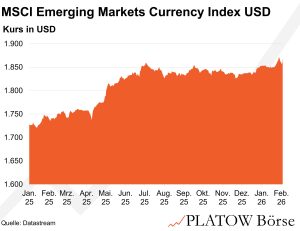 Der US-Dollar (USD) hat zuletzt für Aufmerksamkeit gesorgt, nachdem der Euro zeitweise über 1,20 USD kletterte und der MSCI Emerging Markets (EM) Currency Index neue Höchststände zum Greenback markierte. Zwar hat die US-Währung im Zuge der Diskussion um Kevin Warsh als zukünftigen Fed-Chef zwischenzeitlich wieder etwas Boden gutgemacht. Am Markt halten sich jedoch die Diskussionen über eine anhaltende USD-Schwäche. Daher lohnt ein Blick auf die Implikationen für Schwellenländer, falls sich der Dollarabwärtstrend fortsetzt.