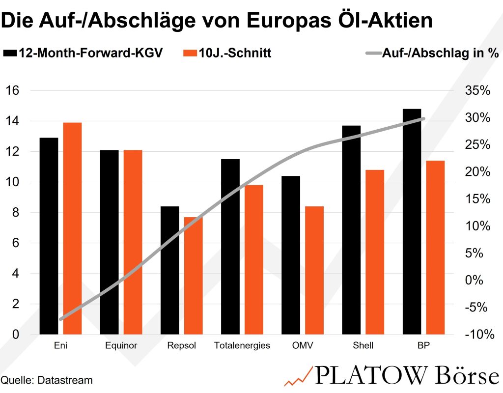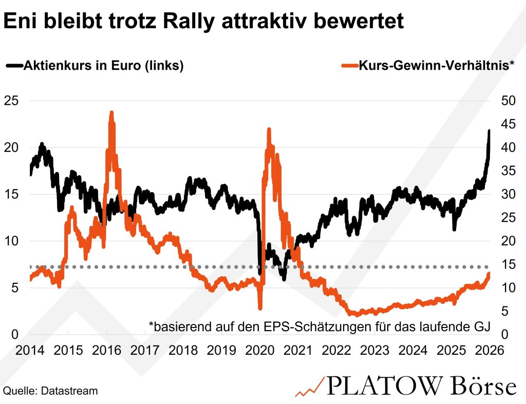 Hinzu kommt für uns ein zweiter Faktor: die Bewertung. Während die europäischen Peers durchweg wieder über ihrem langfristigen Bewertungsniveau handeln, notiert Eni mit einem 12-Month-Forward-KGV von rund 12,9 dank steigender Gewinnerwartungen noch immer leicht unter dem zehnjährigen Schnitt von 13,9.