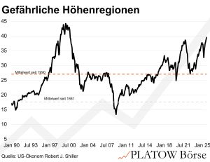 Eine häufig genutzte Kennzahl zur Bewertung einer Aktie oder eines Marktes ist das Shiller-KGV. Der US-Ökonom Robert J. Shiller entwickelte es Ende der 1980er-Jahre, um den S&P 500 ins Verhältnis zu den inflationsbereinigten Durchschnittsgewinnen der vergangenen zehn Jahre zu setzen. Auf diese Weise werden konjunkturelle Ausschläge geglättet und es entsteht ein langfristig aussagekräftiger Bewertungsmaßstab.