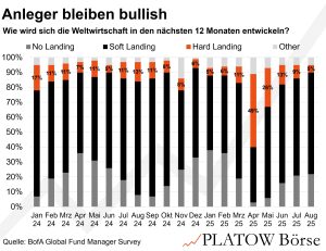 Die Stimmung unter Investoren bleibt unverändert optimistisch und so bullish wie zuletzt im Februar 2025. Laut der monatlichen Fondsmanager-Umfrage der Bank of America ist die Aktienallokation den vierten Monat in Folge gestiegen (Nettoübergewicht 14% nach 4% im Vormonat), liegt jedoch weiterhin unter dem historischen Durchschnitt der letzten 24 Jahre (25%). Die Cashquote verharrt mit 3,9% auf dem niedrigen Niveau des Vormonats. Nur noch 5% der Befragten erwarten innerhalb der nächsten zwölf Monate eine harte Landung der Weltwirtschaft; im Juni waren es noch 13% (siehe Chart).