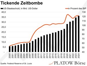 Parallel treibt die US-Regierung die Neuverschuldung voran: Der eingangs erwähnte „Big Beautiful Bill“ dürfte die Staatschulden in den kommenden zehn Jahren um rund 3,1 Billionen US-Dollar erhöhen. Strafzölle auf Importe könnten – je nach Schätzung – zwischen 1,5 und 2,5 Billionen US-Dollar zuschießen, reichen aber nicht, um die steigenden Defizite zu decken.