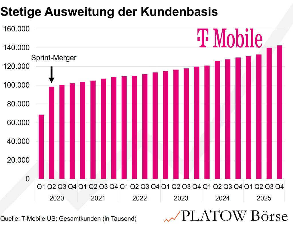 Operativ bleibt das Tempo hoch. Im Q4 stiegen die Serviceumsätze um 10% auf 18,7 Mrd. US-Dollar, im margenstarken Postpaid-Geschäft sogar um 14% auf 15,4 Mrd. Dollar. 962.000 neue Postpaid-Phone-Kunden im Q4 (Verizon: 616.000; AT&T: 421.000) zeigen: Der Konzern wächst schneller als der Markt. Auch im 5G-Breitband kamen fast eine halbe Million Neukunden hinzu. Insgesamt zählt T-Mobile nun 142,4 Mio. Nutzer.